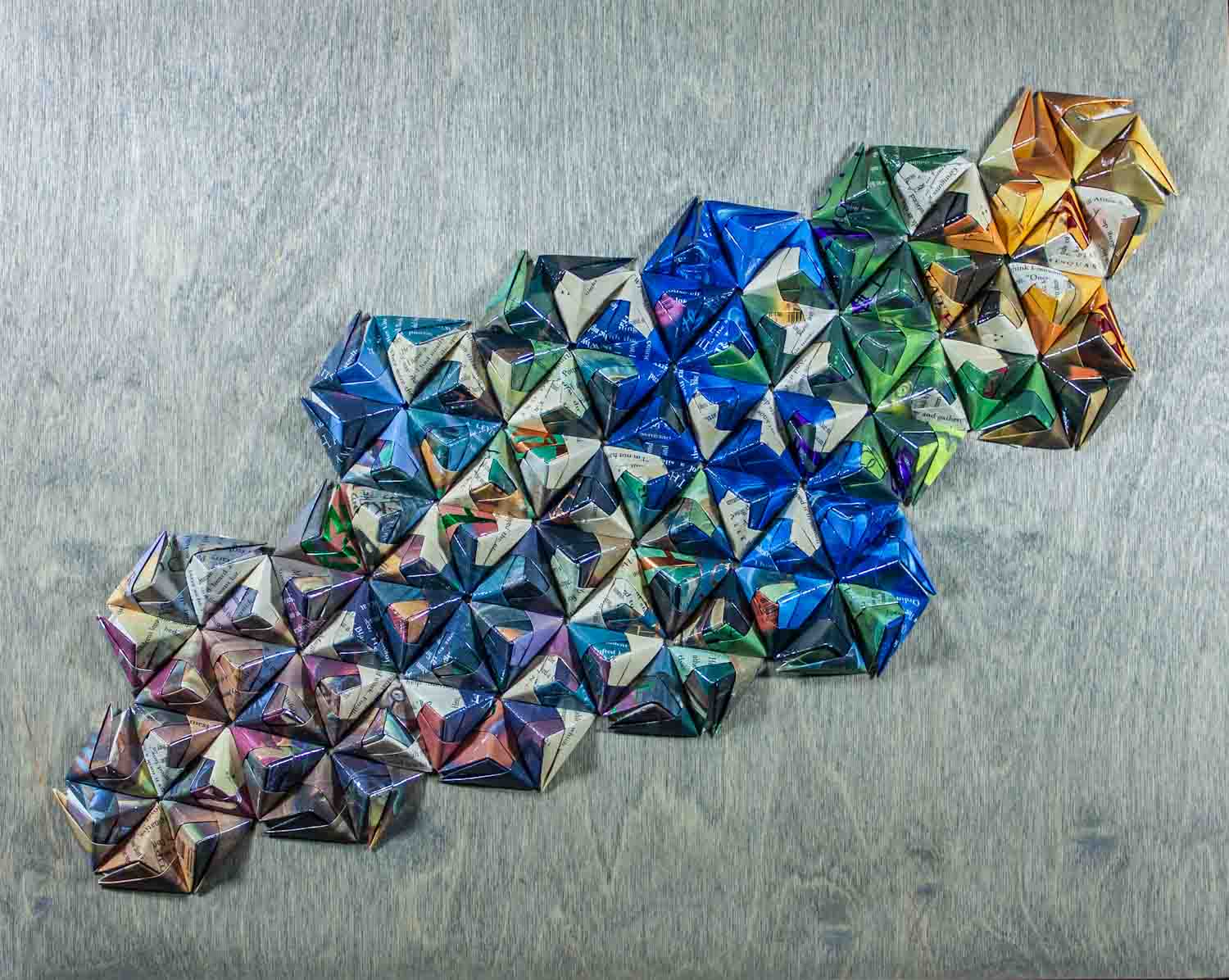 In the beginning there was origami. I’ve been folding for over 30 years. I started with cranes, houses, and balloons but over time I became enamored with modular origami and spent all of my free time folding to create every combination of shapes possible. This led me to my paper diamond, now my most popular line of jewelry.
