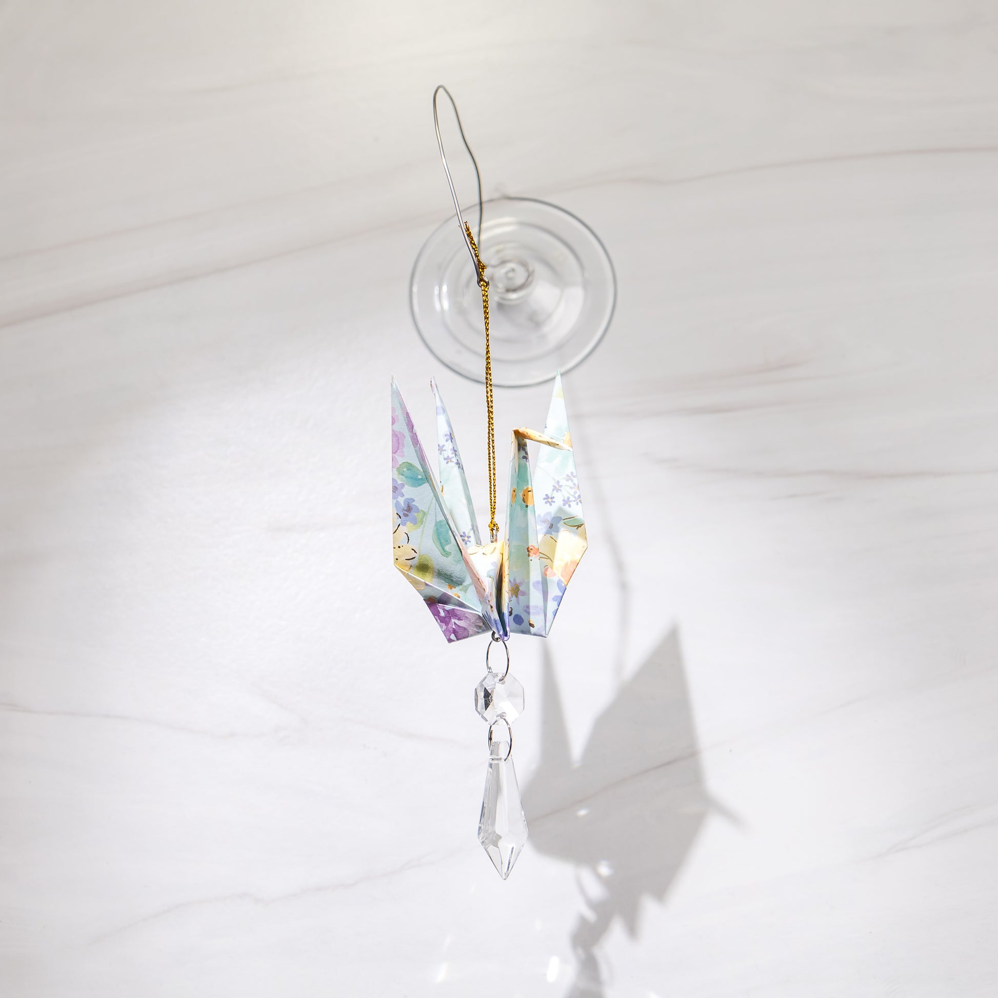 Each suncatcher features a delicately folded origami crane silhouette paired with a shimmering suncatcher prism that scatters rainbows across your room whenever the sun comes through. Hang it in a sunny window to cast soft color around your space, or gift it to someone who could use a little daily magic and meaning.